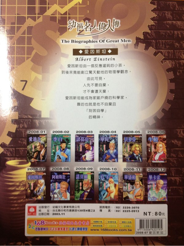 對於初小及中英皆可的孩子,你可看看台灣幼福文化事業出版的中英雙語繪本世界名人偉人傳,香港柏雅出版社似乎拿了版權在香港出版。兩個版本除了價錢分別外,就只是台灣版有印國語注音而港版沒有。