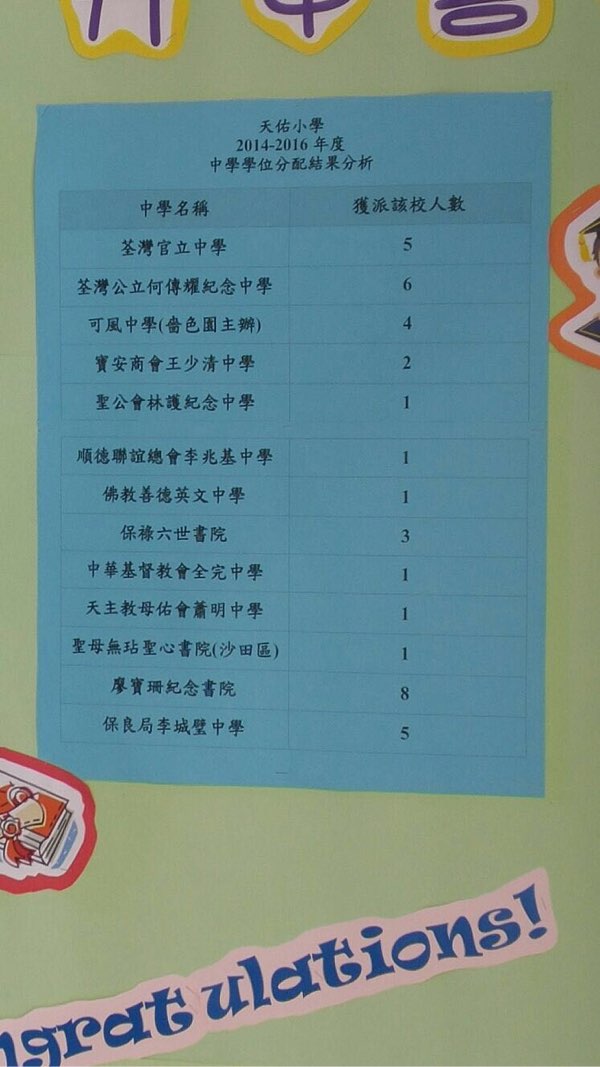本校考獲全級首二十名的六年級學生,可獲推薦報讀荃灣公立何傳耀紀念中學 |