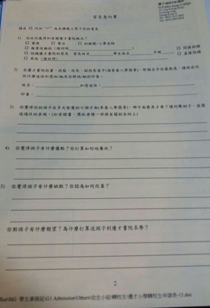 加多少少先, 份表係主要問家長問題多, 除咗小朋友同家長個人資料外, 會問家長點解揀呢間學校, 再根據佢地學校嘅理念寫出點解你認為可以配合到佢地教學理念