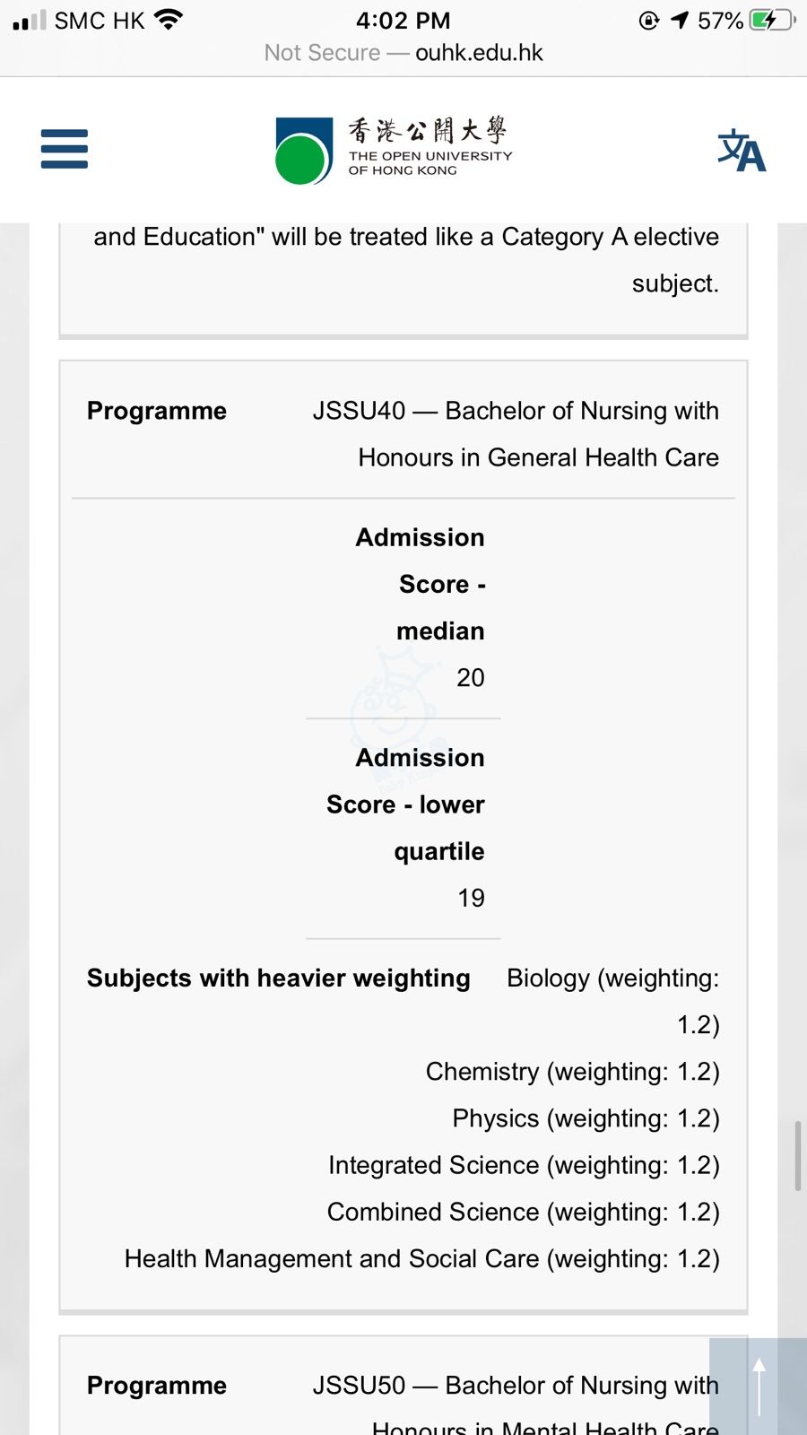 以OU Nursing 為例,show出黎收生分數只係最基本4c+1x, 但幾科理科有較重比重。如a學生最高分elective係中國文學,就會輸俾另一elective為bio的對手,因bio分數係x1.2