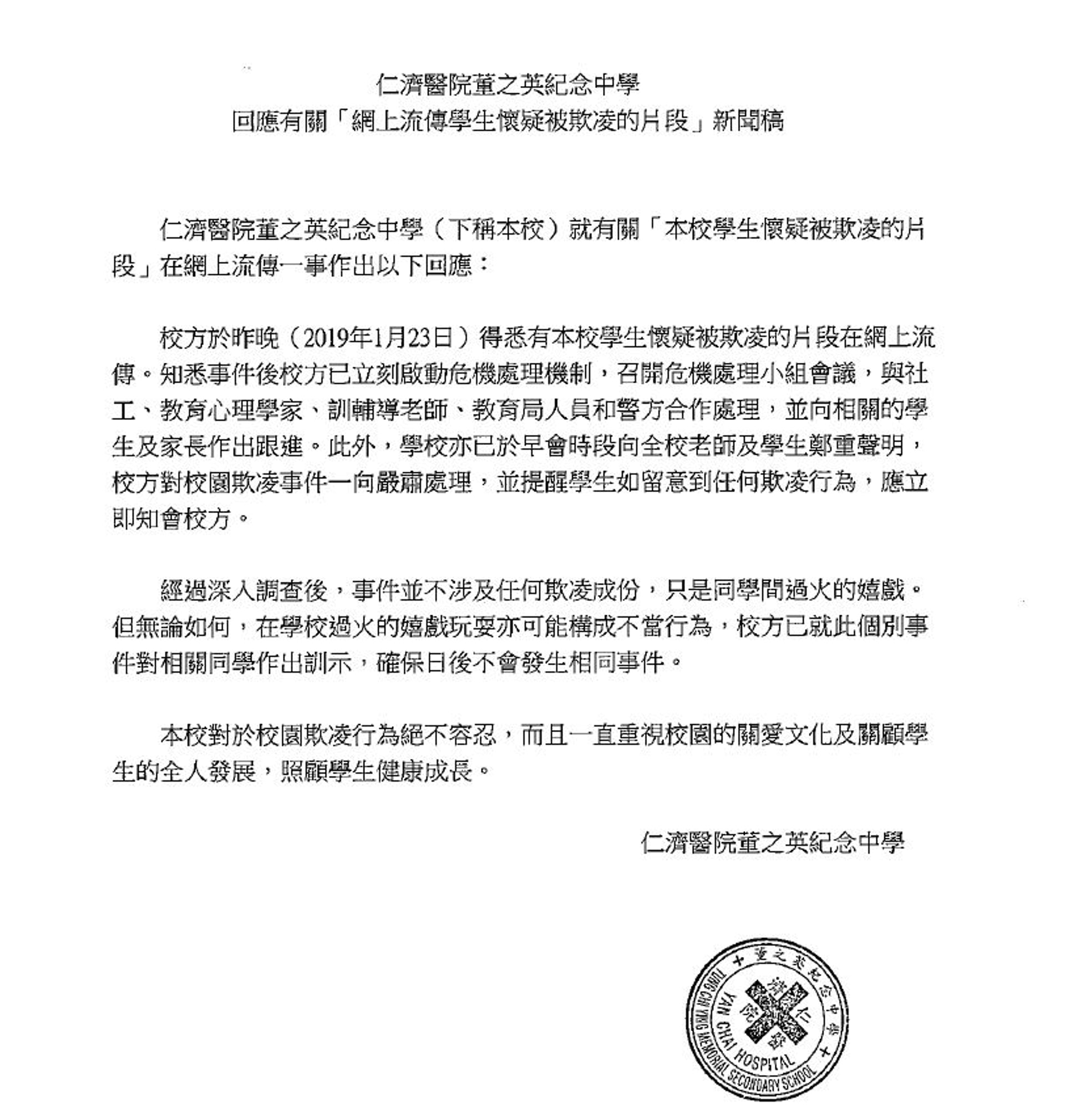 「經過深入調查後,事件並不涉及任何欺凌成分,只是同學間過火的嬉戲。」