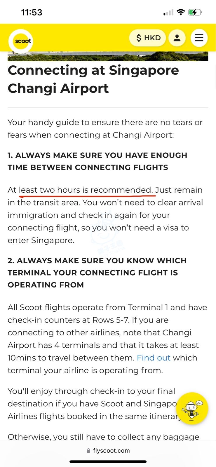 Singapore 轉機最少要預2 小時。