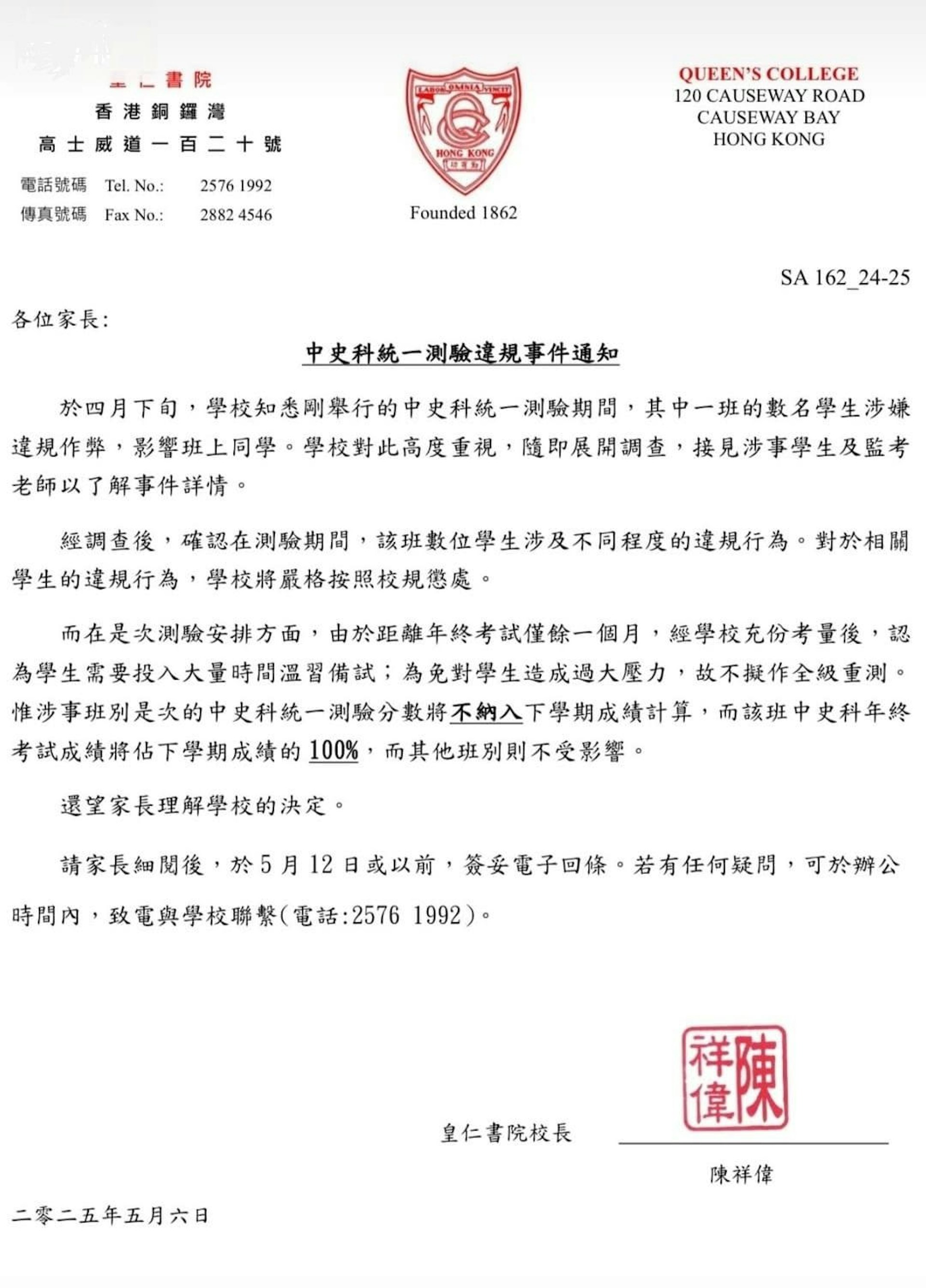 校方在通告指,於4月下旬的中史科統一測驗期間,其中一班的數名學生涉違規作弊。校方未有在通告指出涉事班級,但稱經調查後,確認在測驗期間,該班數位學生涉及不同程度的違規行為。