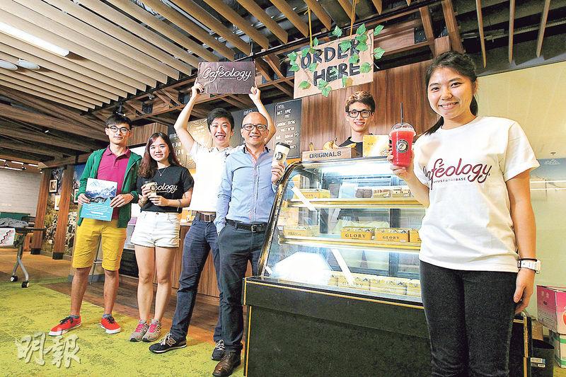科大生鄭曉琳及張紹俊(右一及二)、蘇靜芳及馬穎麟(左二及三)負責營運Cafeology。Cafeology所在地The Base,是科大供師生討論創業計劃的基地,由科大創業中心副主任蕭觀明(右三)及學生王知行(左一)負責管理。