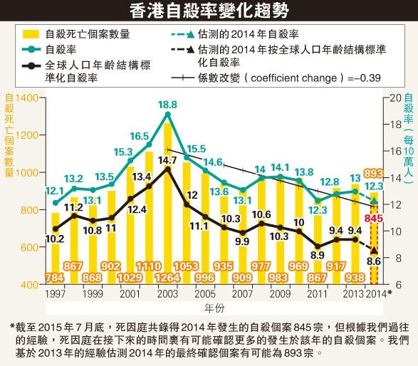 【明報專訊】9月10日為一年一度的世界預防自殺日。香港大學防止自殺研究中心將今年的主題確定為「伸出援手 燃亮生命」。本中心根據死因庭提供的數據,估測2014年香港每10萬人中約12.3人死於自殺。為使自殺率數據更具有國際可比性,我們將該數據按國際人口的年齡結構進行標準化,得出標準化的自殺率為每10萬人中8.6。對比世界衛生組織公布的全球標準化自殺率水平每10萬人11.4,可以見到香港已連續4年低於全球平均水平。香港的標準化自殺率不僅低於亞洲區的發達國家如日本(18.5)、韓國(28.9),也低於西方發達國家如美國(12.1)、澳洲(10.6),但高於英國(6.2)。