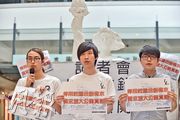 城大學生會外務副會長梁曉暘(左)表示,學生會月初把校內4個水樣本送往化驗,發現邵逸夫創意媒體中心(CMC)3樓及7樓的水樣本含鉛量超標。會長朱國智(中)要求校方立即停用CMC所有食水系統及為全校所有供水設施驗水。