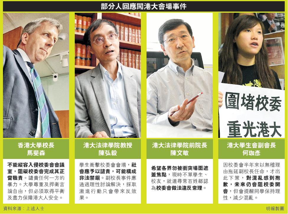 【明報專訊】對於數十名香港大學學生前晚衝擊校委會會議一事,港大校長馬斐森昨日發公開信指不能縱容學生的做法,港大法律學院教授陳弘毅亦斥責學生可能構成非法禁錮,社會應予以譴責。獲薦出任副校長的陳文敏則稱,學生的手法是否值得商榷可以討論,但校委會違常理,不應讓衝突遮蓋焦點;港大學生會為混亂致歉,但稱日後仍會阻止委員進入會議室,會提點同學保持理性。