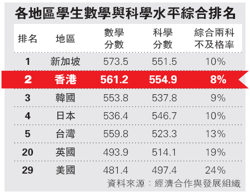 經濟合作及發展組織比較七十六個國家和地區的十五歲學生的基礎學習認知能力和知識掌握,香港學生表現名列第二,顯示香港教育制度縱使備受批評,仍然能夠有驕人表現,不宜妄自菲薄,不過仍有須改善之處。