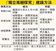 【明報專訊】高中通識科要求學生做獨立專題探究(Independent Enquiry Study,IES),有教師指部分學生濫用網上問卷,例如做老人中心設施專題時,在網上做問卷調查,但訪問目標(長者)較少上網。有大學教授一年收到數十名學生的訪問要求,發現學生只依賴她提供的意見交功課,並沒真正做探究,因此成立網站,以短片及研究案例等教授學生獨立探究的方法。