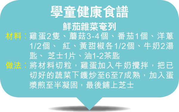 香港營養師學會認可營養師吳耀芬指,以6至11歲只有輕度活動量的男生為例,每日所需熱量為1,350至1,825千卡;女生每日則需1,225至1,700千卡。中學生正值青春期,應增加熱量及蛋白質攝取,有助提升其脂肪及肌肉量。