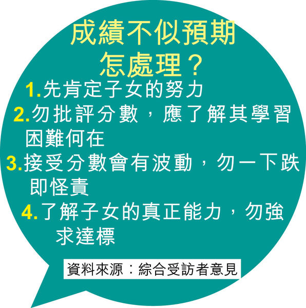 資助小學校長會名譽主席林湘雲指,不少家長對英、數科成績特別緊張,會怪責小朋友粗心大意,「平時識做,點解考試失分。」但他告誡家長,最重要是要令子女保持學習興趣,認清子女的能力,切忌強求,「勿將自己理想套用到子女身上,留意孩子有哪些強項,重點培育更好。」