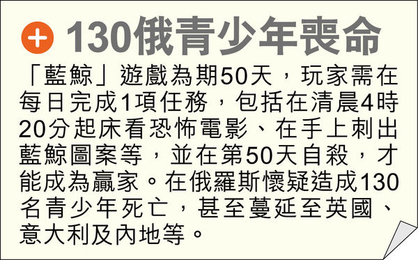 「藍鯨」遊戲正蔓延至英國、意大利及內地等地方。(網上圖片)