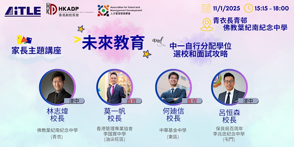 👥 重量級校長分享: 何迪信校長 (中華基金中學) 莫一帆校長 (香港管理專業協會李國寶中學) 呂恒森校長 (保良局百周年李兆忠紀念中學) 林志煒校長 (佛教葉紀南紀念中學)