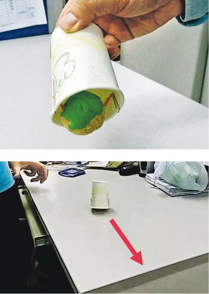 該校常識科科主任陳敬文表示,拉動紙杯機械人(見圖)中的橡筋涉及動能及勢能概念,但不宜跟二年級學生提及專門名詞,只能以簡單的句子表達,如橡筋含彈性,當學生把紙杯向後拉時,杯中的泥膠便會帶動橡筋向後捲,橡筋同時儲存動能,一放手,橡筋的能量便會釋出,然後驅向前,令紙杯移動。教師其後可以回力玩具車作例子,進一步說明先把車子拉後,放手後車子便會向前,加深學生印象。