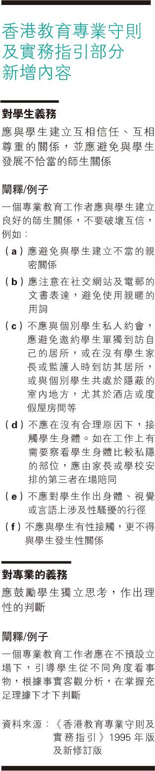 議會提出修訂《香港教育專業守則及實務指引》(下稱守則)的諮詢稿,並於本月23日或之前接受意見。對比現時所用的《守則》,教師「對學生的義務」範疇中「應與學生建立互相信任、互相尊重的關係」一項,修訂增加了「並應避免與學生發展不恰當的師生關係」一句,並補充6點闡釋和例子,如避免與學生建立不當親密關係、不得與學生發生性關係等(見表)。