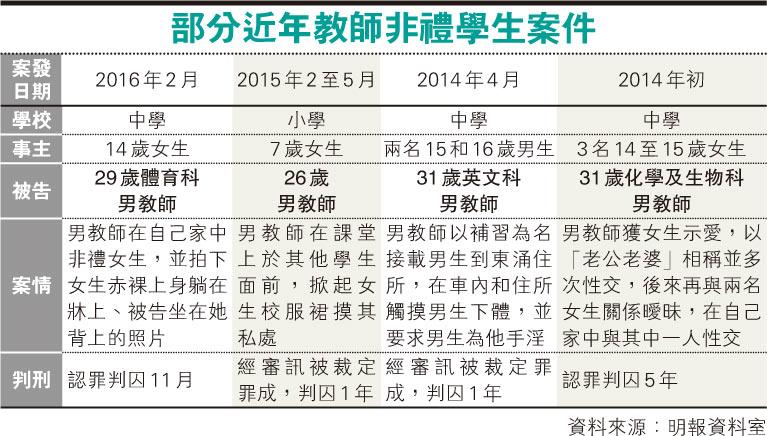 【明報專訊】近年發生多宗涉及教師和學生的風化案,教育人員操守議會建議修訂教師守則,新增內容包括教師應避免與學生建立不當親密關係、應注意在社交網站及電郵的文書表達,避免使用親暱用詞、不應與學生私下約會,避免與學生在隱蔽室內地方獨處等。議會主席鄒秉恩接受本報訪問表示,議會留意到現有守則有所不足,故修訂增加具體例子,冀4月前將建議交教育局。