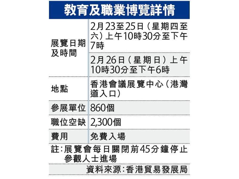 貿發局助理總裁張淑芬昨日介紹博覽詳情,表示有來自22個地區逾860間參展單位參加,為市民提供升學及就業資訊,當中也有多個政府部門及公私營機構如警務處、機場管理局、中原地產等,將在會場內進行招聘,預計會有來逾2,300個職位空缺,當中包括專為年輕人提供的暑期工和實習機會。