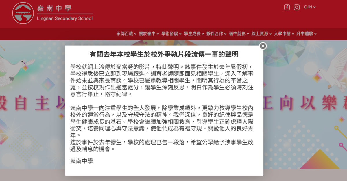 學校就網上流傳於麥當勞的影片,特此聲明。該事件發生於去年暑假初,學校得悉後已立即到現場跟進。訓育老師隨即面見相關學生,深入了解事件始末並與家長商談。學校已嚴肅教導相關學生,闡明其行為的不當之處,並按校規作出適當處分,讓學生深刻反思,明白作為學生必須時刻注意言行舉止,恪守紀律。